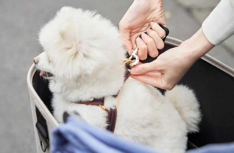 コット内にある「飛び出し防止用リード」を、必ず首輪やハーネスに繋いでください。