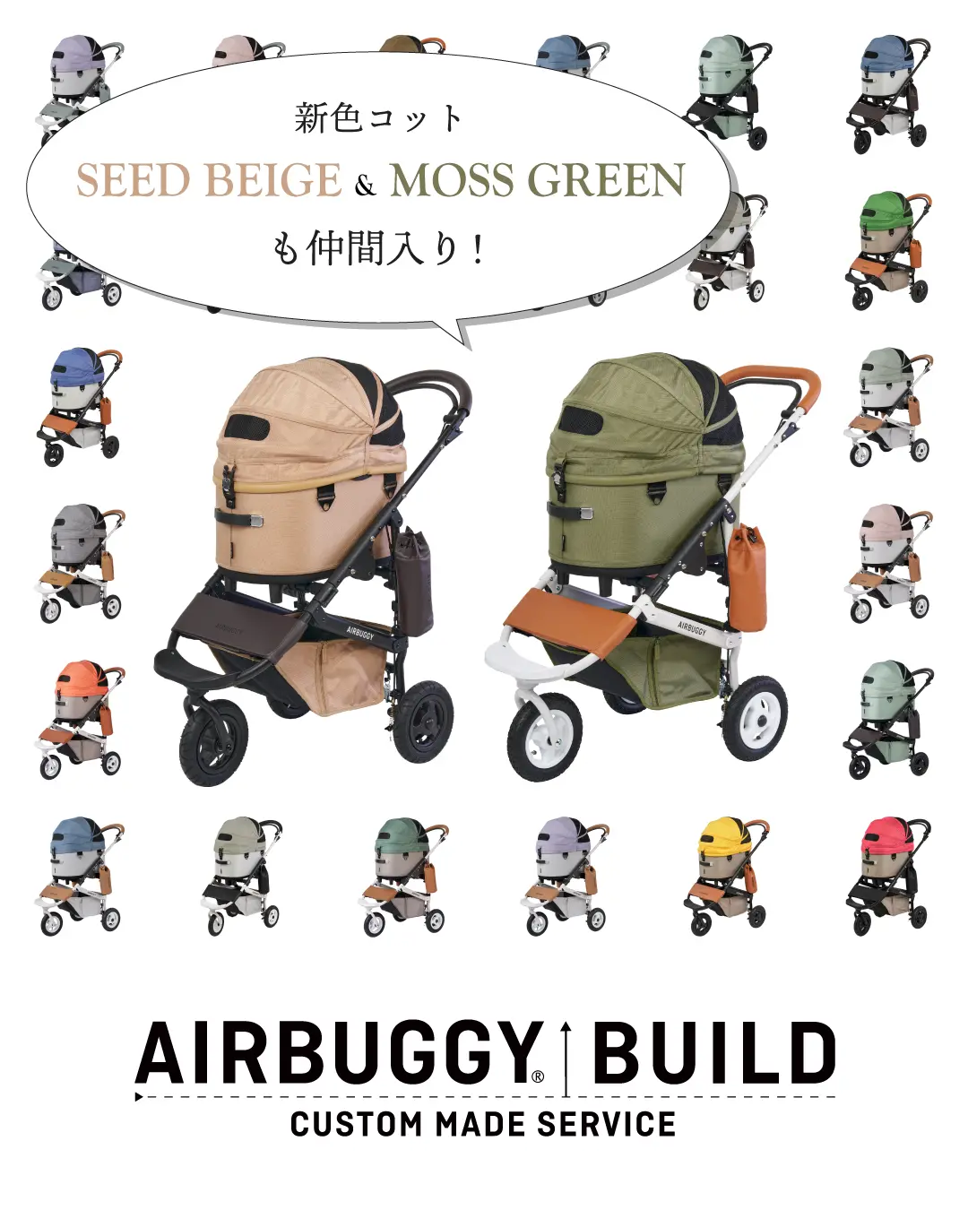 直営店限定のカスタマイズオーダー「BUILD(ビルド)」に、3月5日(木)よりAIRBUGGY PET CLUBメンバー限定で、DOME3 PREMIERモデルの人気カラー「SEED BEIGE(シードベージュ)」と「MOSS GREEN(モスグリーン)」が加わります。